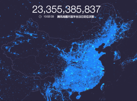 由于位置服务的可视化通常是帮助用户或者决策方通过大量位置信息的变化来了解人群的位置信息变化,所以数据量会非常大,经常是百万级、千亿级的数据量需要表达给决策者。位置数据可视化就是用来将空间分布上的规律信息更加简洁直观的展示出来,同时挖掘更深层次的信息。例如下图所示,就是腾讯地图展示的全球定位次数,通过在地图上打点的方式,表达出人流的位置分布,通过疏密度和点的闪耀亮度来直观的告诉用户,某个时间人流的变化情况。
