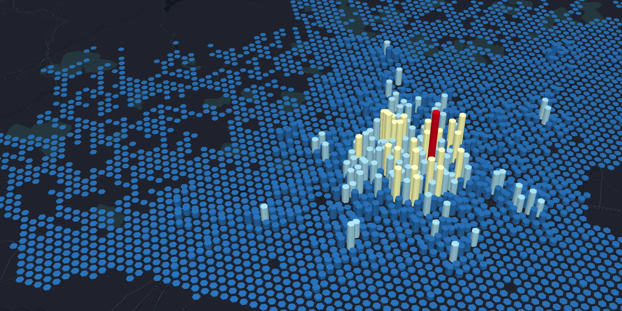 例如,蜂窝热力是通过六棱柱的高度、色值来表达出位置数据的变化和密度。在一些连锁商超,不同的店铺在各自区域内的到店人数就可以通过蜂窝来呈现, 可以帮助决策者掌握每家店铺的人流情况,以便进行货物的配送调整、店铺的营销策略优化等。