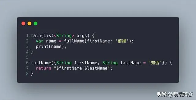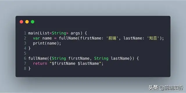 Dart有一个叫做命名参数的东西,当使用命名参数时,你必须在调用函数时指定参数的名称。要启用命名参数,只需使用大括号{}将参数包装在函数中。