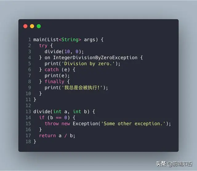 Dart还提供了一个finally块,无论是否抛出异常,都将始终执行。