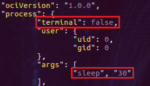 - 创建一个config.json文件,这个文件是一个标准的OCI格式的文件,把 "terminal": true 改为 false,把 "args": ["sh"] 改为 "args": ["sleep", "30"]