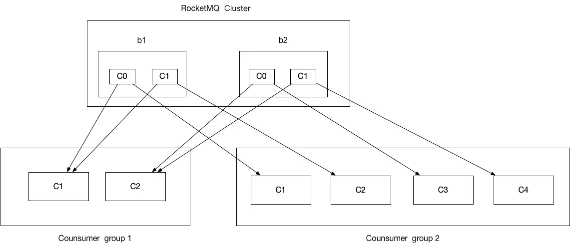 队列会在 broker 中抽象成一个 consumer queue,在集群模式下,每个队列每个消费组只能存在一个消费者进行订阅消费,但是一个消费者可以消费多个队列,这也保证了在集群模式下消息不会被重复消费,如下图所示:
