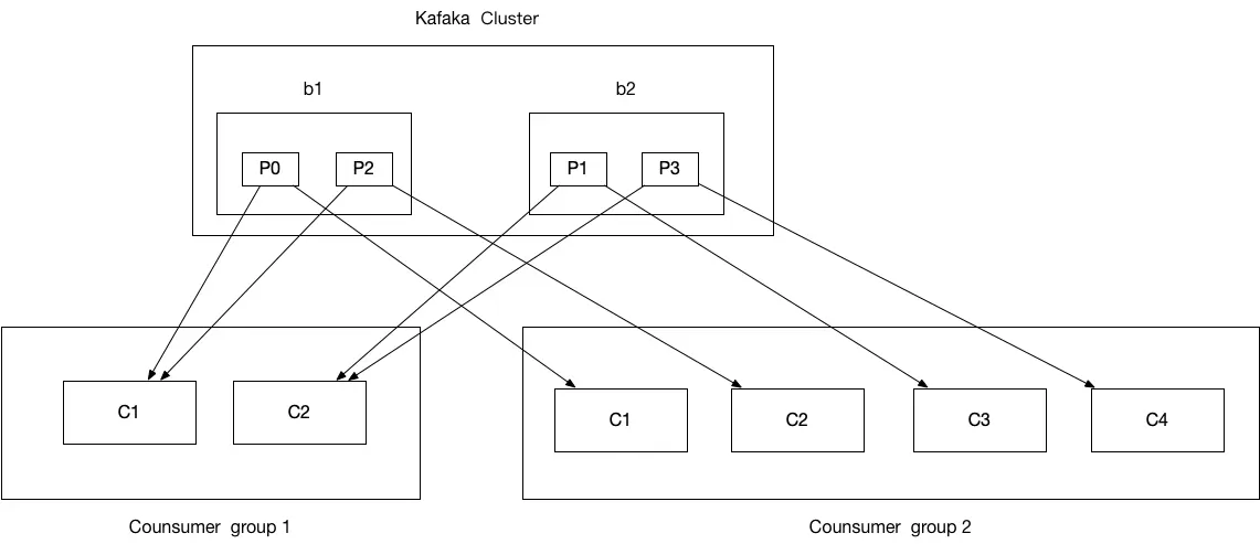 在 Kafka 中,一个主题在集群中会拥有一个以上分区,每个分区在每个消费集群中只能有一个消费者进行订阅消费,,但是一个消费者可以消费多个队列,与 RocketMQ 队列一样: