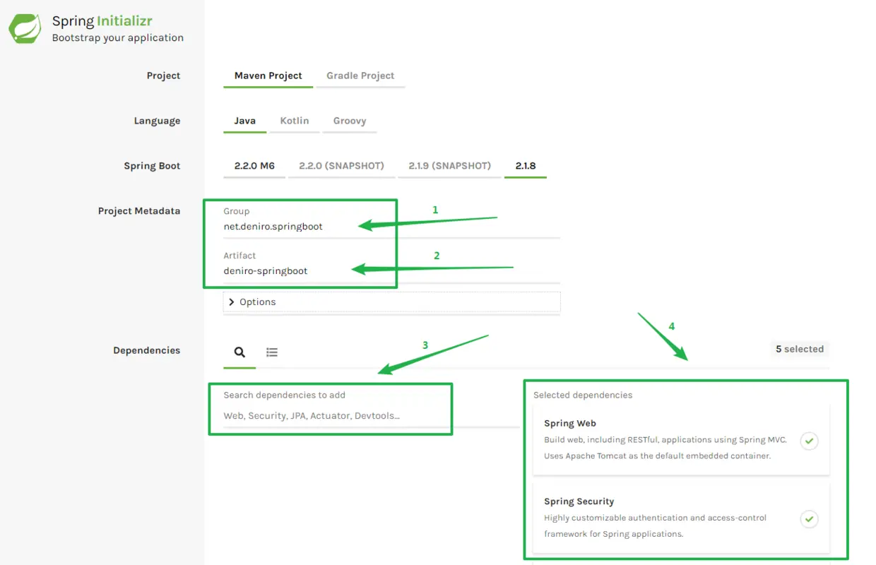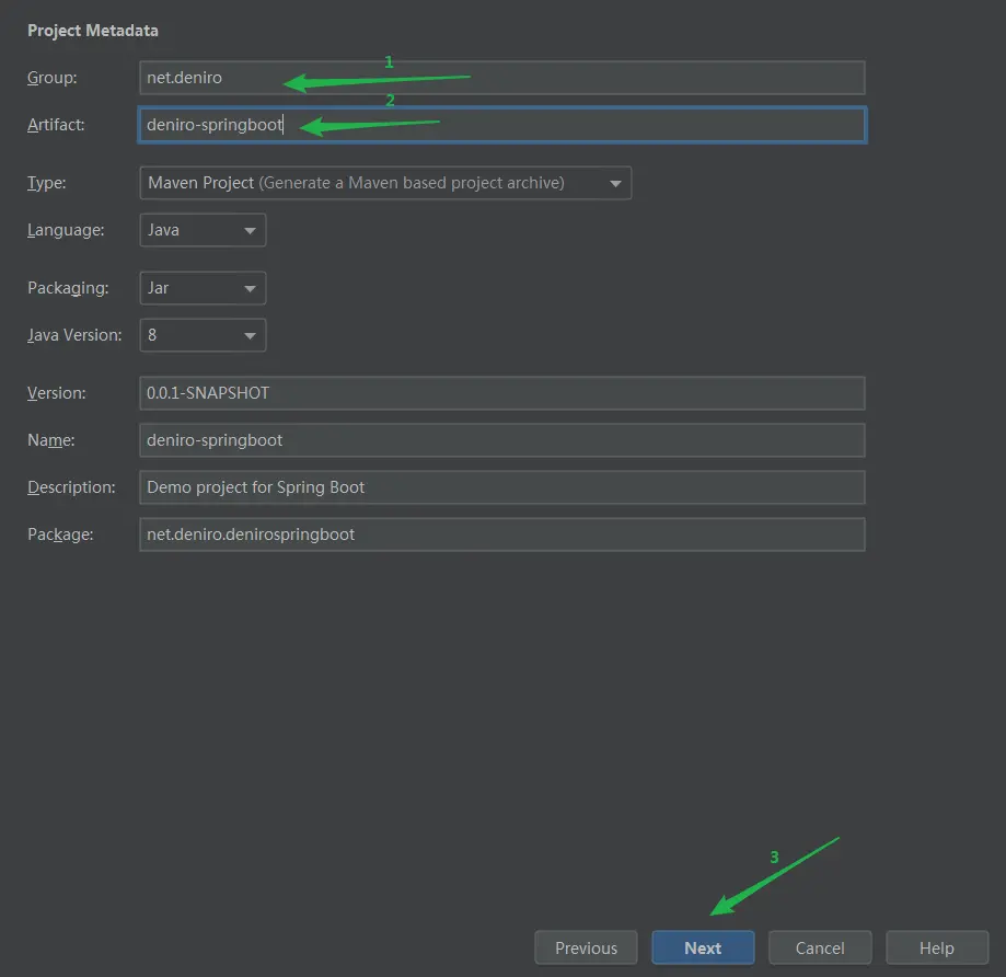 - 表单头三项分别表示:基于 Maven 还是 Gradle 来构建项目、使用的编程语言以及 Spring Boot 版本。
