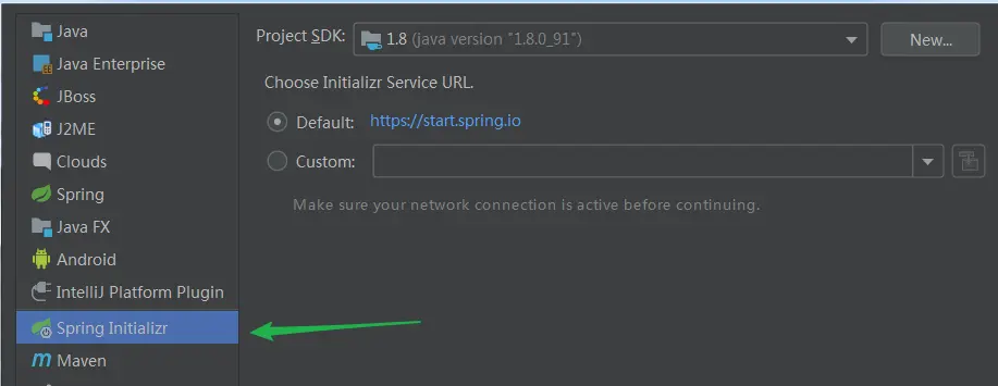 选择 Spring Initializr,默认基于 Spring Initializr 官网 URL 地址进行初始化: