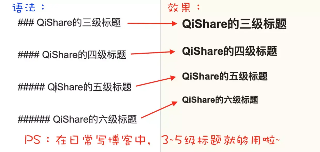 - 标准语法:使用1~6个“#”符 + “空格” + “你的标题”。