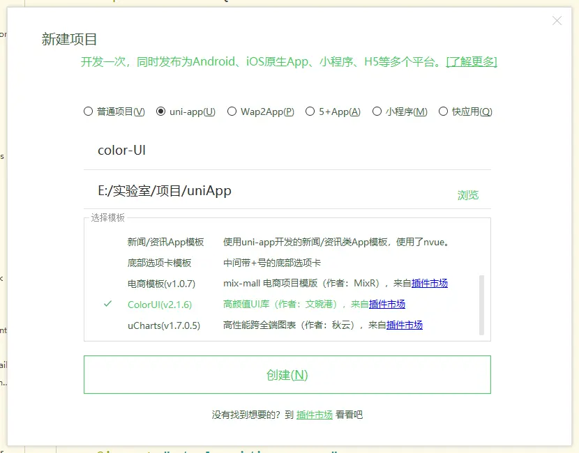 选择uni-app,输入项目名称,这里有很多模板,选择你所需要的。为了之后表述方便,这里先创建了ColorUI模板,为了方便以后引用ColorUI。然后有创建了一个默认模板,这个默认模板文件很少,方便以后自由开发。如下两图所示。