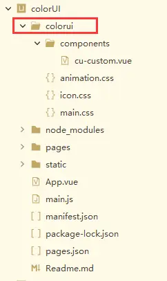 首先复制一下ColorUI项目目录下的colorui目录,然后粘贴到demo项目的根目录下,与pages目录同级。