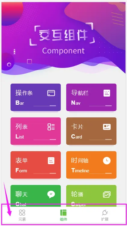 当点击“元素”,“组件”,“扩展”三个按钮的其中之一时,都会出现相应的页面,原因就是在ColorUI的项目里mian.js里要引入下面的代码: