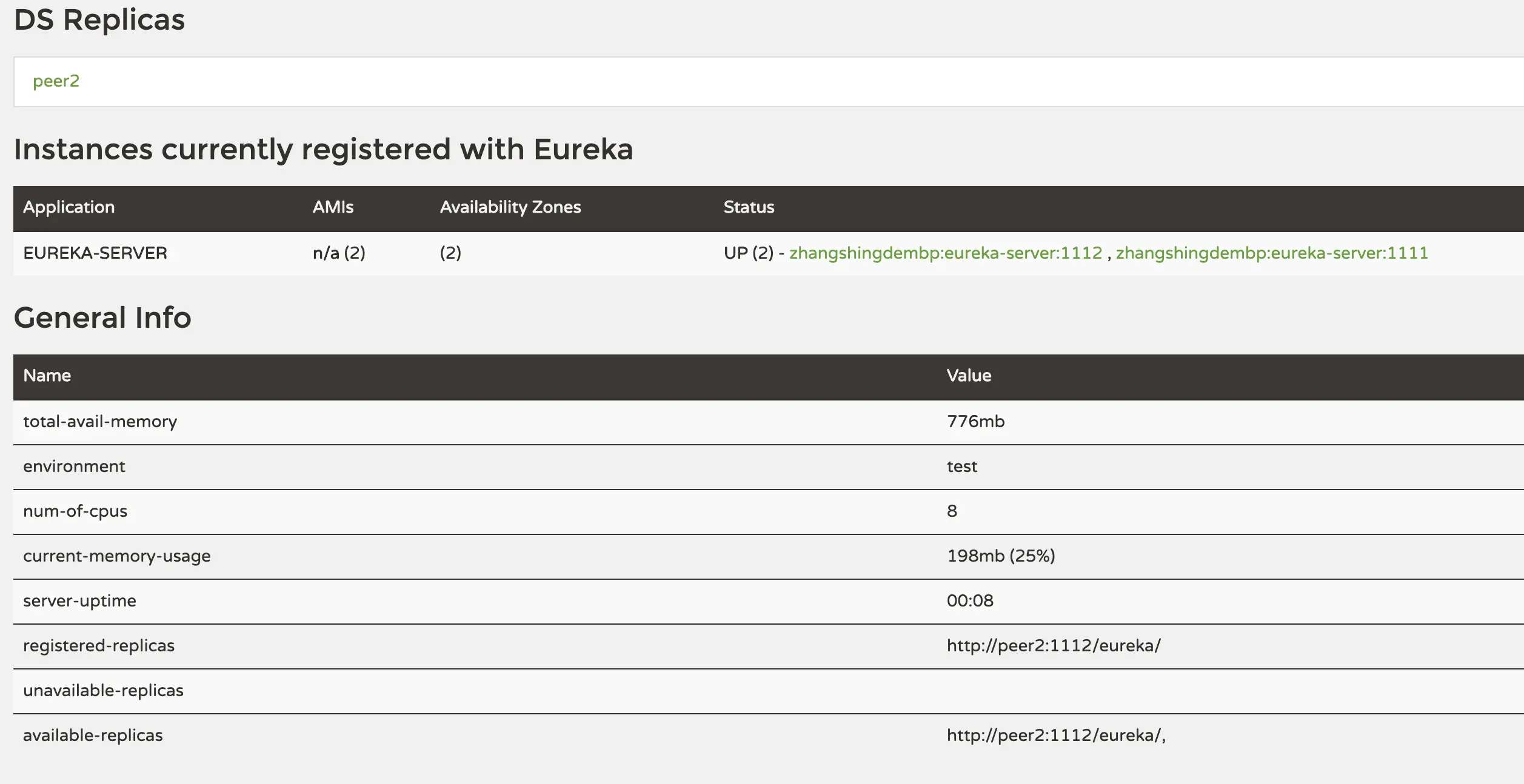 spring.profiles.active属性来分别启动peer1和peer2:java -jar eureka-server-1.0-SNAPSHOT.jar --spring.profiles.active=peer1 java -jar eureka-server-1.0-SNAPSHOT.jar --spring.profiles.active=peer2