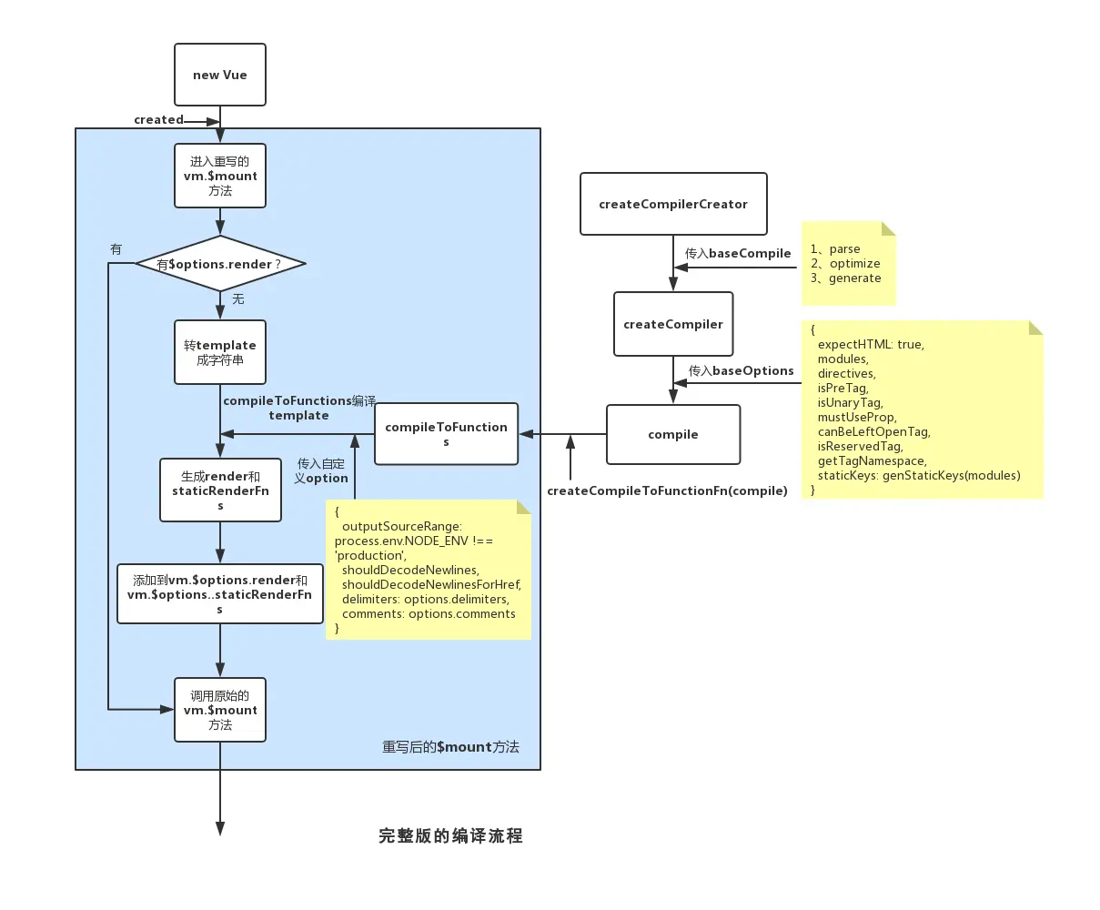 为了探究Compiler的原理,我们找到完整版的入口文件entry-runtime-with-compiler.js,发现其重写了$mount函数:如果没有render函数,则转换template为字符串,再调用compileToFunctions进行编译,最终将render和staticRenderFns挂到$options下并调用原始的$mount。通过对compileToFunctions的层层剥离,我们可以得到最终的结果: