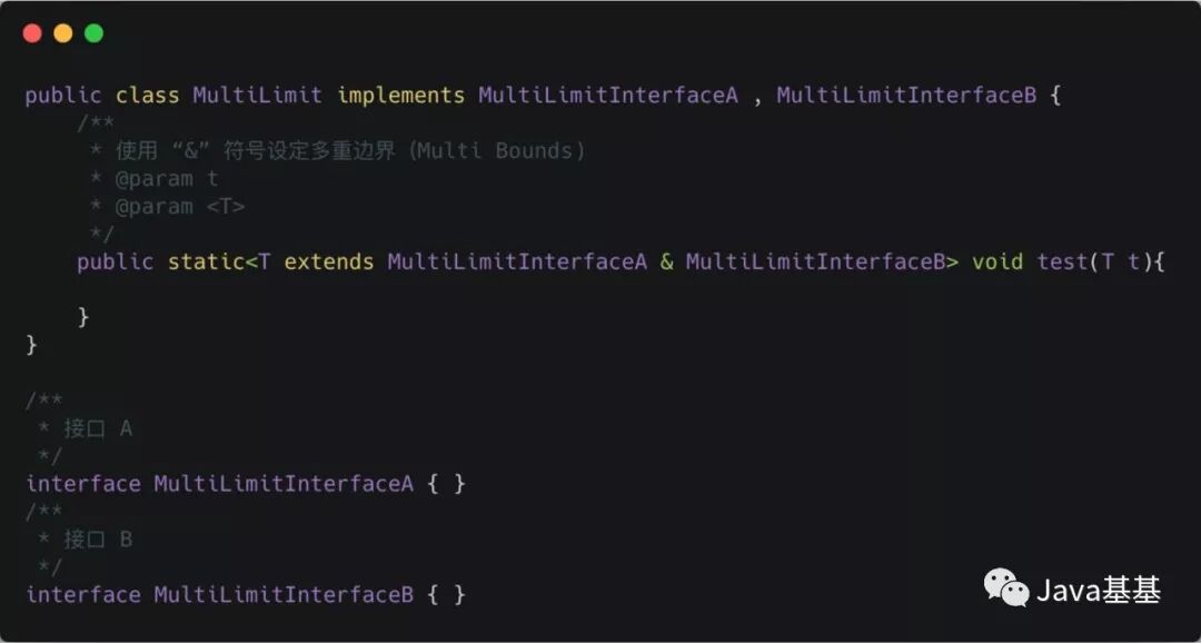 使用 & 符号设定多重边界(Multi Bounds),指定泛型类型 T 必须是 MultiLimitInterfaceA 和 MultiLimitInterfaceB 的共有子类型,此时变量 t 就具有了所有限定的方法和属性。对于通配符来说,因为它不是一个确定的类型,所以不能进行多重限定。