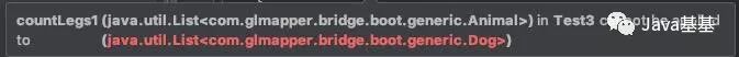 static int countLegs (List<? extends Animal > animals ) { int retVal = 0; for ( Animal animal : animals ) { retVal += animal.countLegs(); } return retVal;}static int countLegs1 (List< Animal > animals ){ int retVal = 0; for ( Animal animal : animals ) { retVal += animal.countLegs(); } return retVal;}public static void main(String[] args) { List<Dog> dogs = new ArrayList<>(); // 不会报错 countLegs( dogs ); // 报错 countLegs1(dogs);}