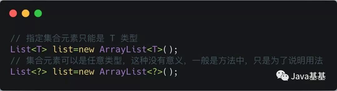 所以,对于不确定或者不关心实际要操作的类型,可以使用无限制通配符(尖括号里一个问号,即 ),表示可以持有任何类型。像 countLegs 方法中,限定了上届,但是不关心具体类型是什么,所以对于传入的 Animal 的所有子类都可以支持,并且不会报错。而 countLegs1 就不行。
