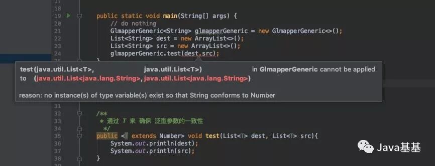 // 通过 T 来 确保 泛型参数的一致性public <T extends Number> voidtest(List<T> dest, List<T> src)//通配符是 不确定的,所以这个方法不能保证两个 List 具有相同的元素类型public voidtest(List<? extends Number> dest, List<? extends Number> src)