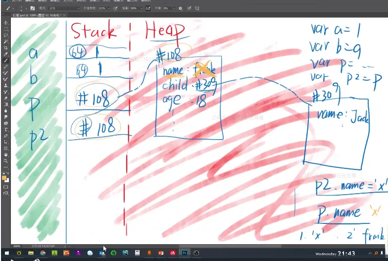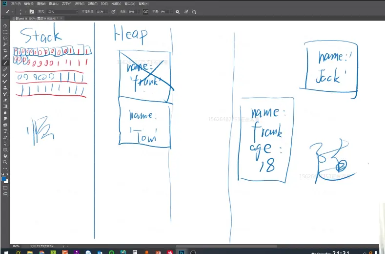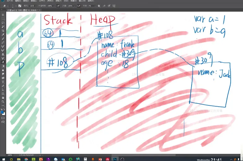 Stack区特点:所有数据都按顺序存放。所以Stack区的数据存储后比较难进行增删,因此Stack区存储的数据一般是 具体的数据(可以用64位2进制表示清楚,如:Number,String,Boolean)或是一个指向Heap区的地址 。