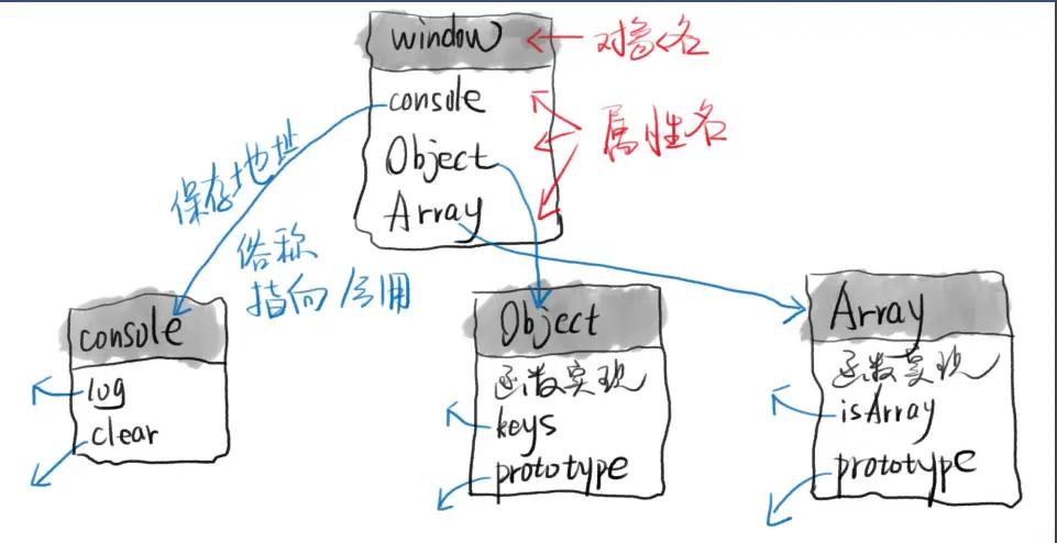 var x = window这样就能用x变量来指向window对象,但是这种做法反人类。 - 同理:console与console对象,Object与Object对象也是两个东西。