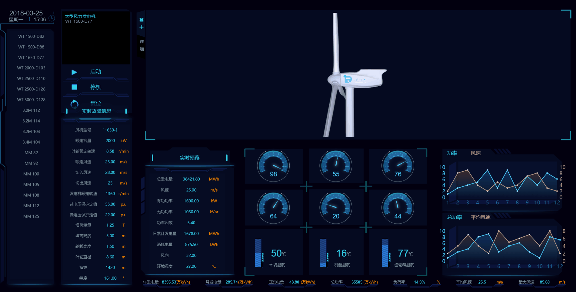 在这个页面中非常具体而又全面的展示了风机设备的相关设备信息,比如风机设备名称,风机参数,发电量数据,机舱温度以及功率风速折线图表等等,这对于管理员而言是一种享受!