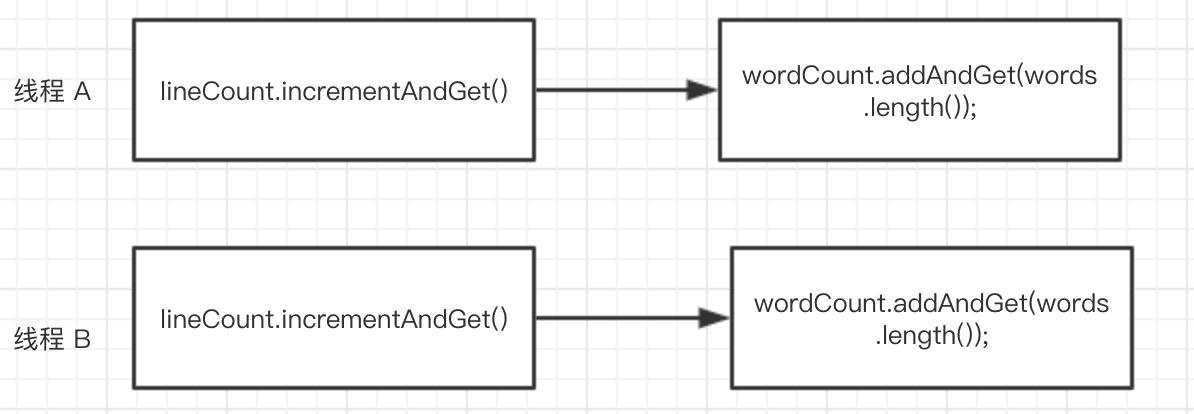 结果显而易见,这段代码不是线程安全的。因为 lineCount 和 wordCount 是两个变量,尽管它们各自是线程安全的,但线程 A 进行 lineCount 加 1 的时候,并不能够保证线程 B 是在线程 A 执行完 wordCount 统计后开始 lineCount 加 1 的。