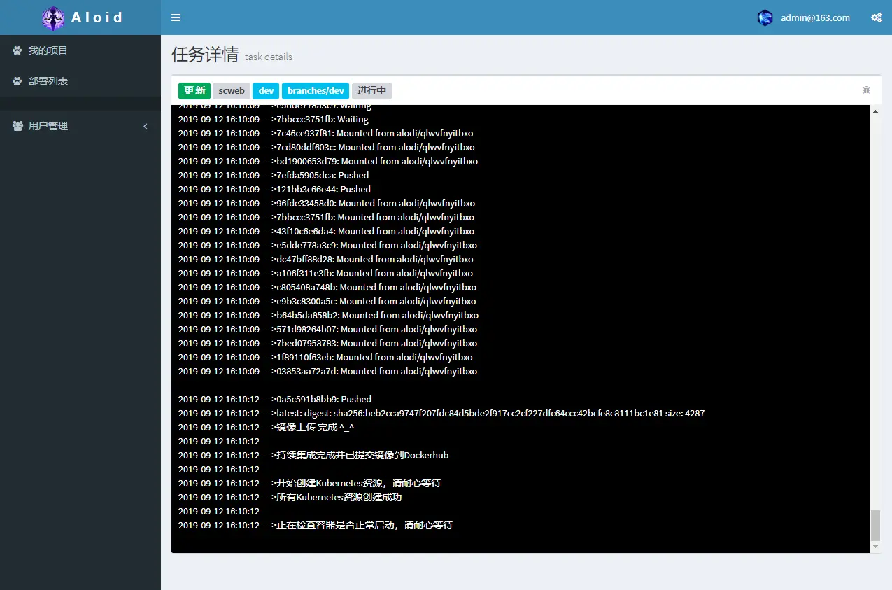 当填写相关信息点击Build & Deploy按钮后会跳转到任务详情页,这个页面实时展示部署过程的日志输出,右上角有个爬虫的按钮,可以终止部署