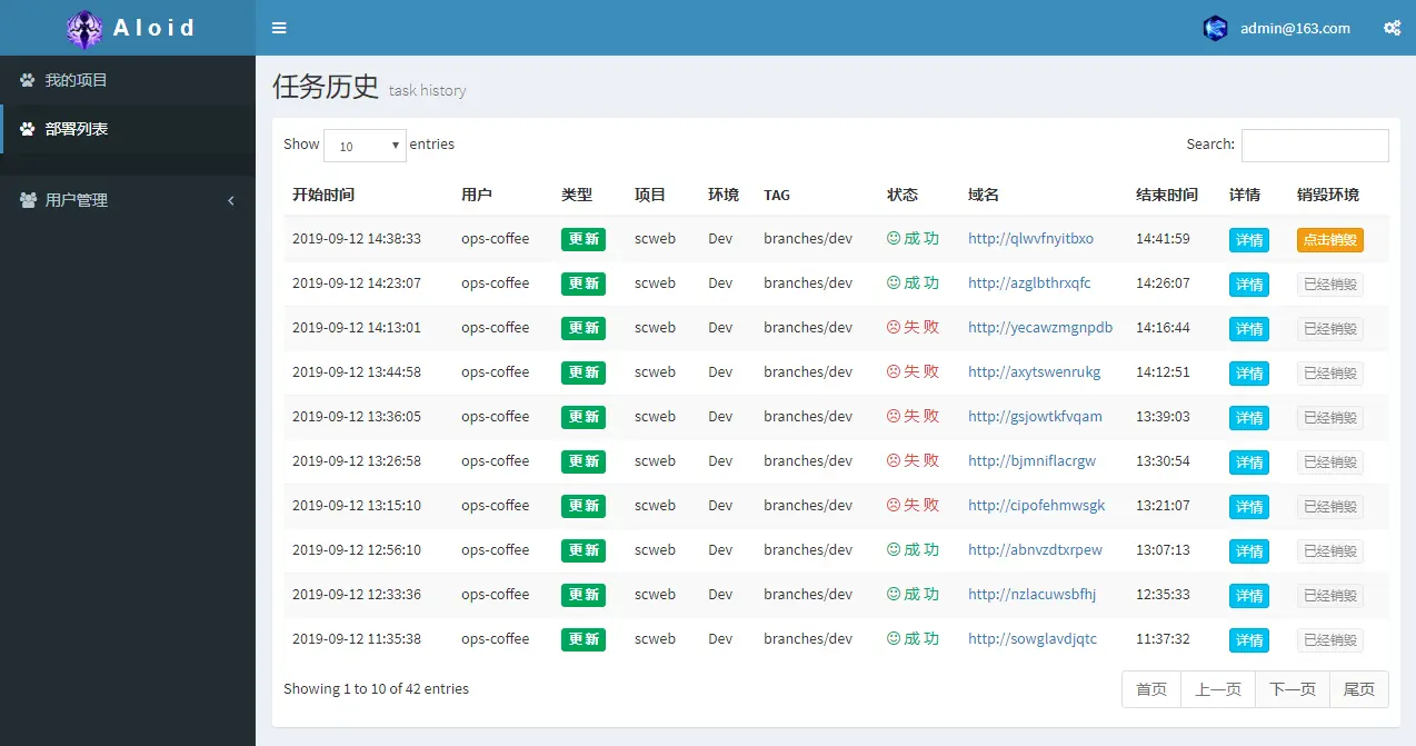 部署列表页:可以在部署列表页查看到部署历史记录,当这个环境正在运行时可以点击销毁按钮来销毁项目,清除kubernetes的资源占用