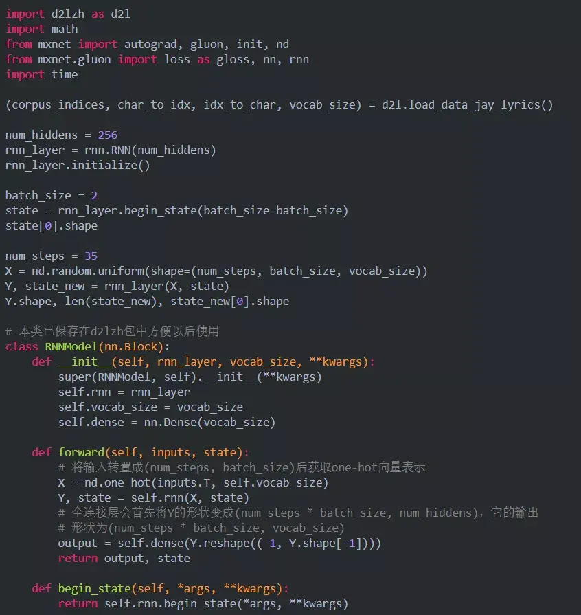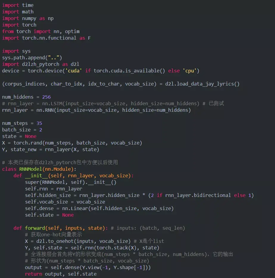 如下是原书采用 RNN 建模语言模型的部分代码(原书 6.5 章),我们主要抽取了模型定义部分:
