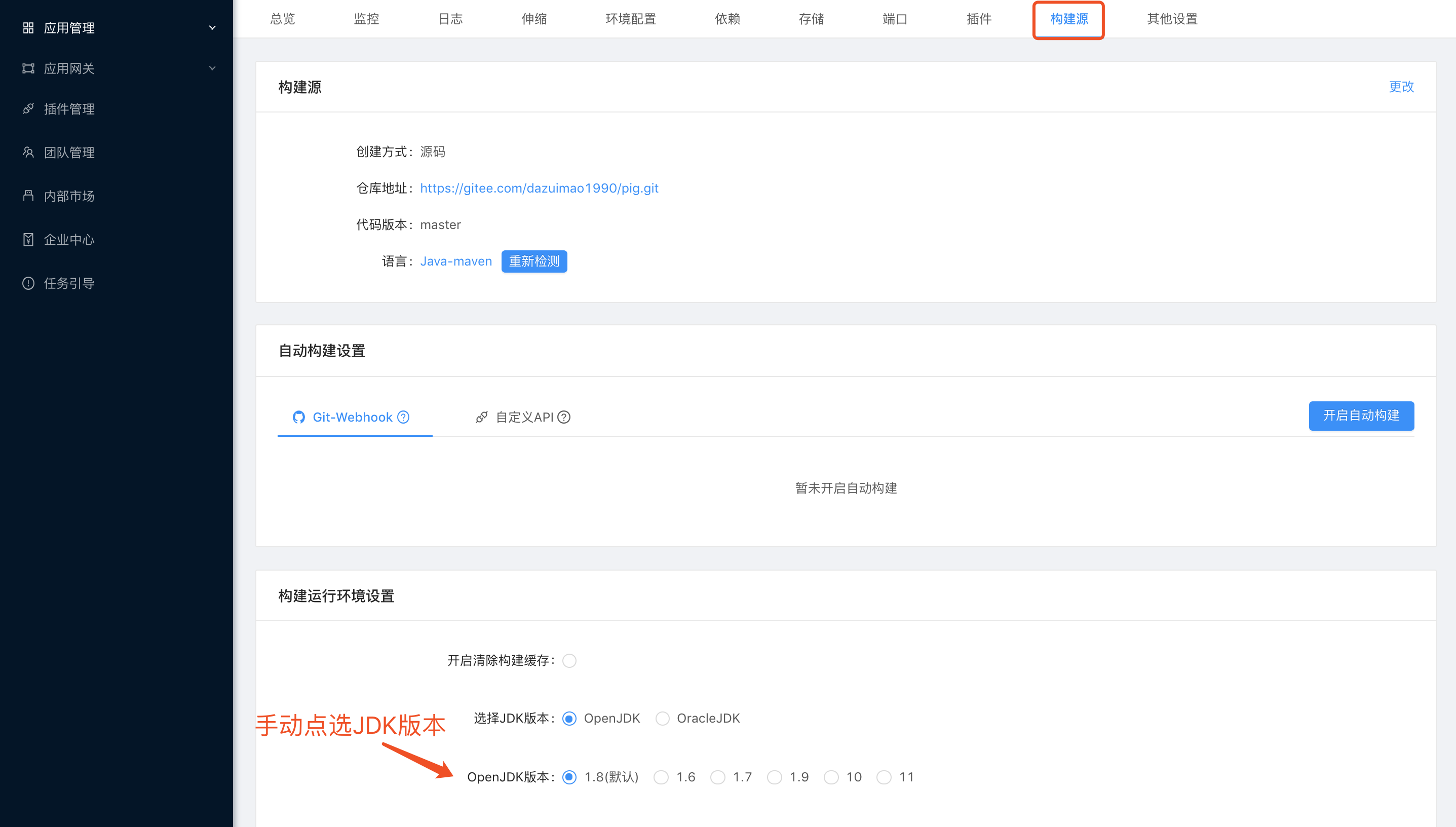- 在平台WEB界面指定自定义JDK地址,设置处为应用构建源。