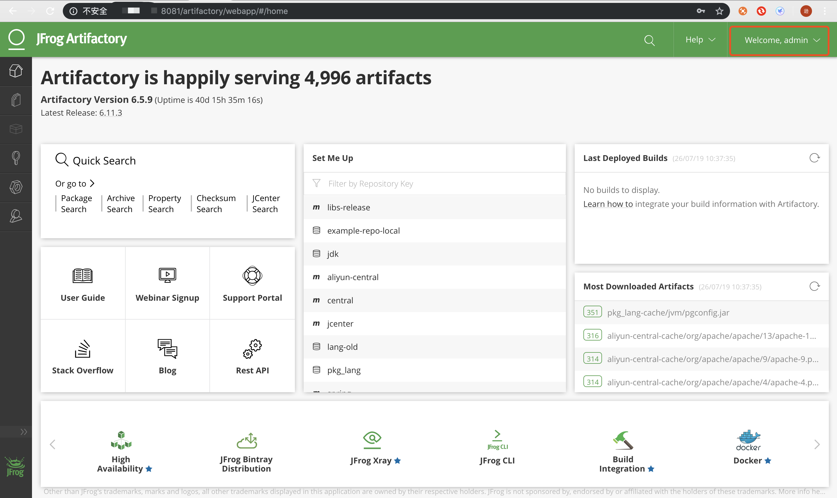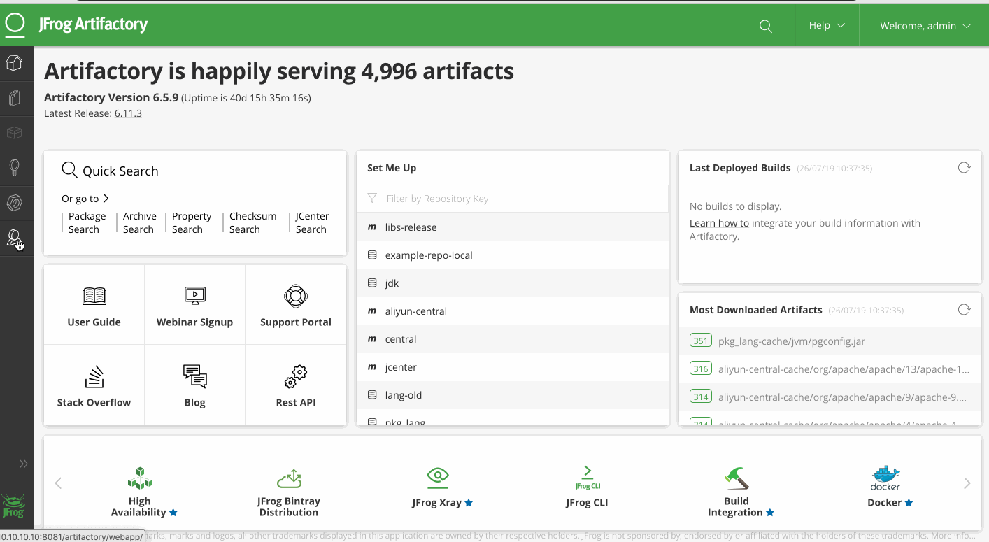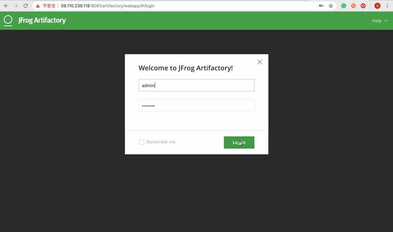http://<管理节点IP>:8081登录 Artifactory,默认凭证: admin/password