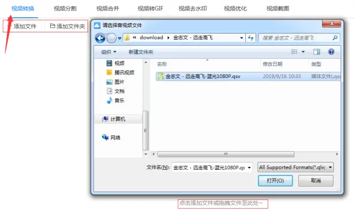 1、首先把在爱奇艺下载好的qsv格式的视频添加到迅捷视频转换器中,添加的时候可以点击添加文件按钮也可以直接用拖拽的方式添加视频。