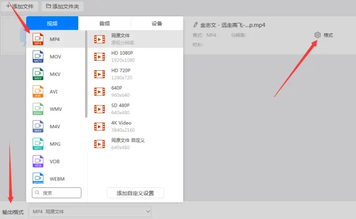 2、添加好视频后点击转换器中的格式或输出格式按钮设置输出的视频格式,因为要把qsv格式转换成mp4所以把输出的视频格式设置的mp4格式。