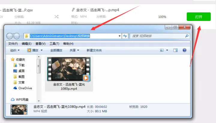 5、当视频转换好后点击覆盖在转换按钮上的打开按钮或者找到之前预设好的输出路径就可以到达视频转换后的输出路径找到mp4文件了。