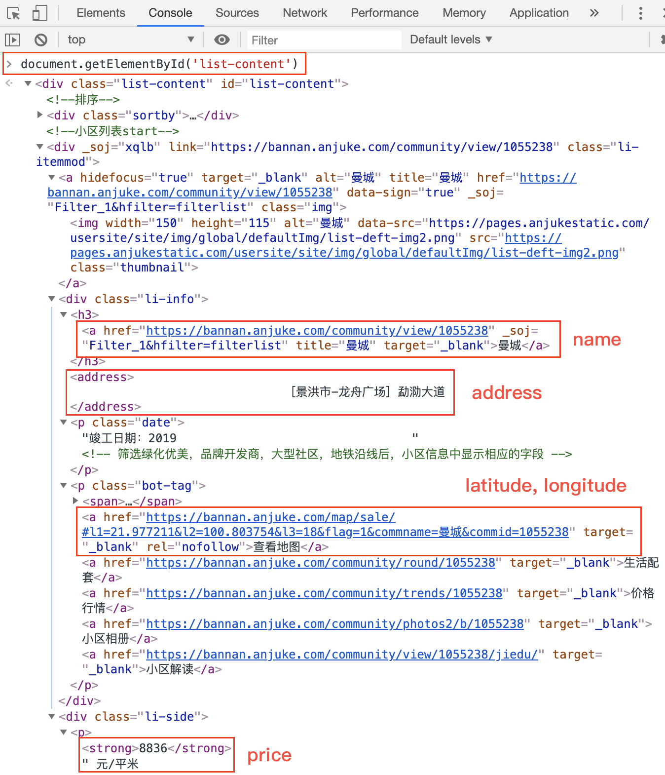 在开发者工具控制台(Console)中,输入 document.getElementById('list-content') 回车。逐次展开 dom 树,找到目标数据所在的元素。下图标注出了本文目标数据字段所在的 dom 元素: