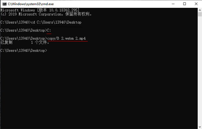 3、然后输入盘符,再输入copy/B 2.webm 2.mp4。(文件名不能有符号及中文)如图: