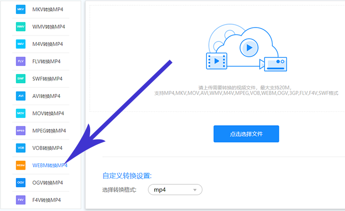 2、然后点击选择文件,将桌面上的webm视频全部都上传到网站中,然后再设置转换后视频的格式为mp4格式。