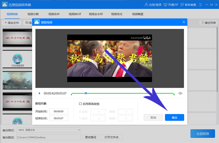 3、然后如果需要将视频剪短,那么可以点击视频文件后面的裁剪按钮,进入之后可以选择需要裁剪的开始和结束时间,然后裁剪完毕后点击确定即可。