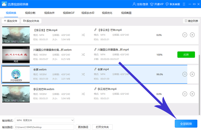 4、最后都设置完成后就可以将webm格式的视频转换成mp4视频格式了。当软件转换到了100%,那么就是转换成功了。
