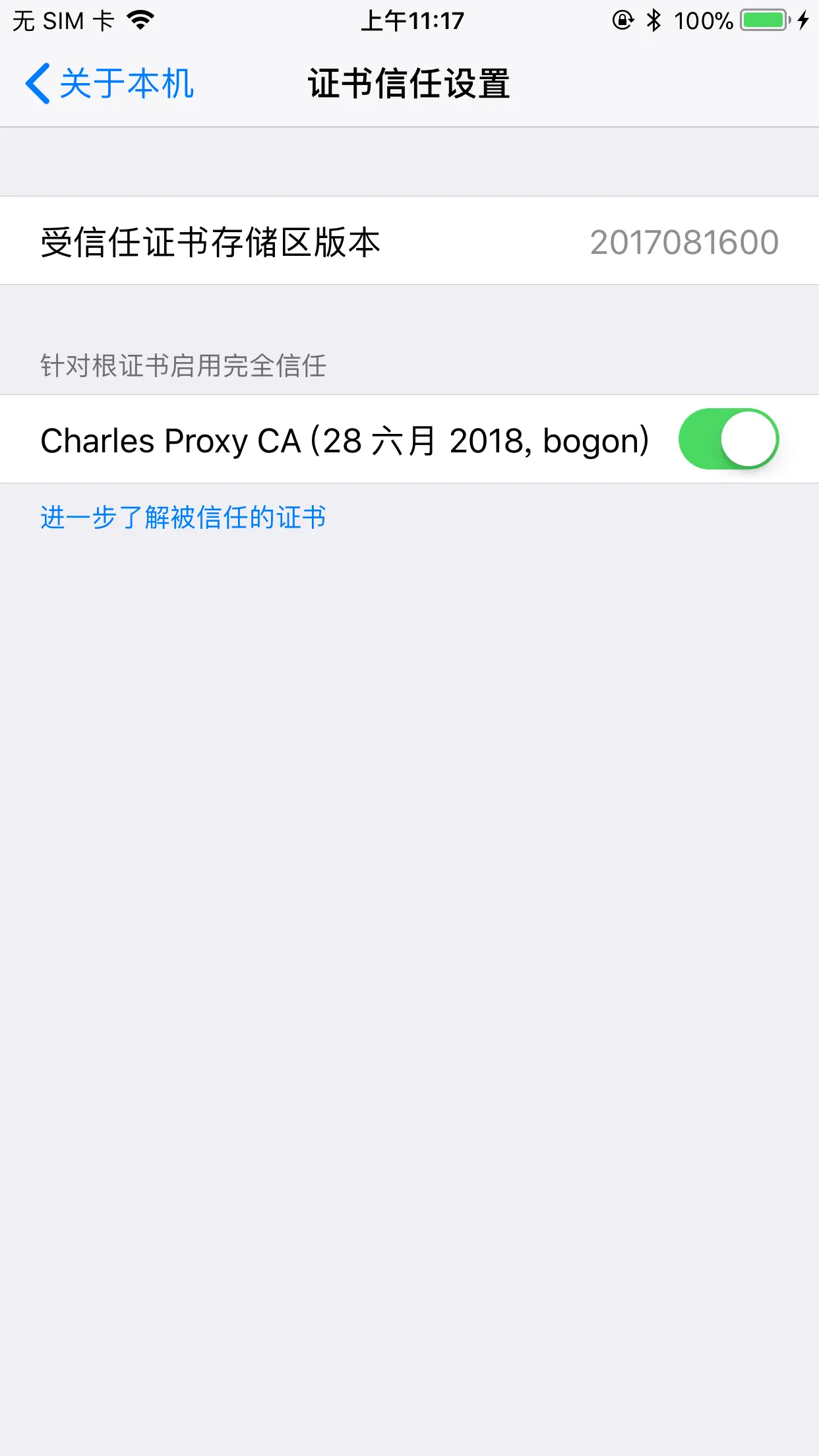 在设置--通用--关于本机中--证书信任设置中信任证书