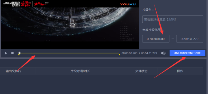 3、添加好视频后右侧会出现视频的进度条,此时我们要设置提取的视频片段(开始时间和结束时间),可以在当前片段范围中设置,也可以移动黄标调整,调整好后点击确认并添加到输出列表即可。