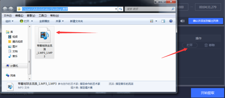 5、当视频转换好后点击覆盖在提取按钮上的打开按钮或者直接根据之前预设的输出路径打开转换后的文件夹就可以找到转换后的mp3音频格式了。