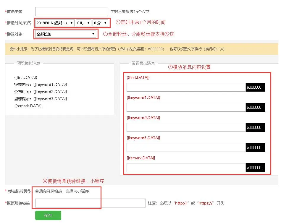 模板消息可以设置定时未来1个月的时间点,支持全部粉丝、分组粉丝群发,模板内容可以修改颜色和换行,粉丝接收模板消息后点击可以跳转外部链接或小程序。