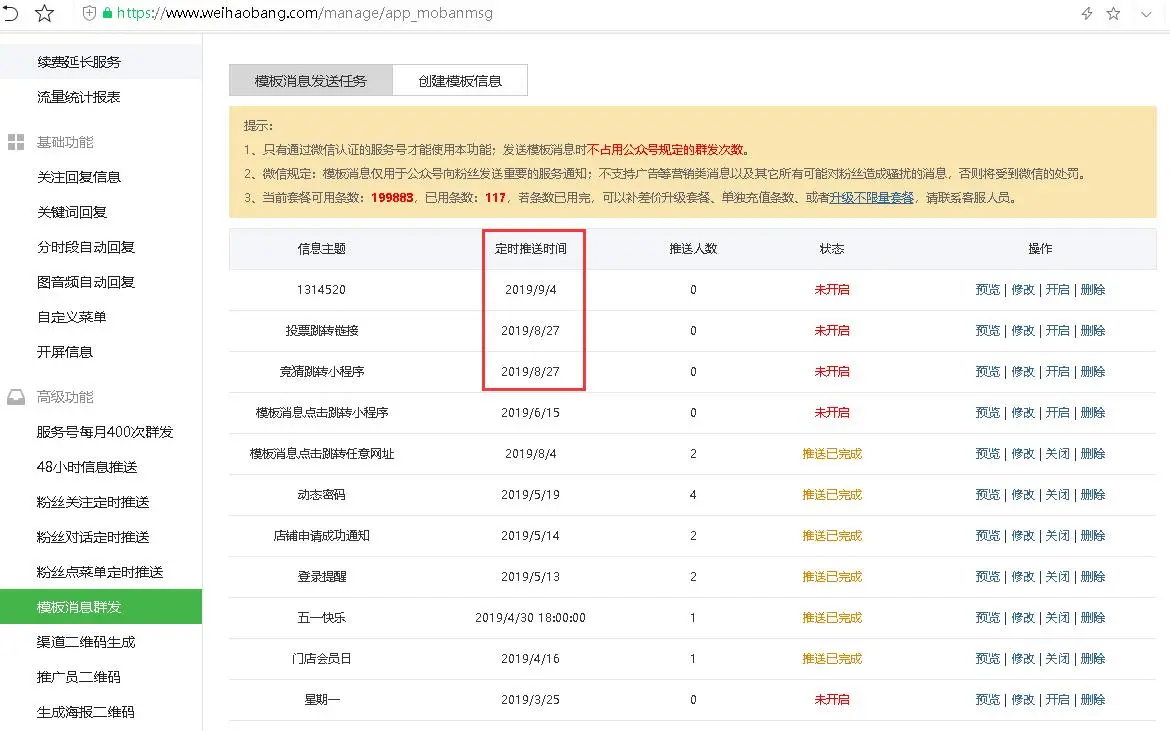 已认证的服务号才能使用,不占公众号群发次数,每天都可以发送,模板消息群发免费试用7天。