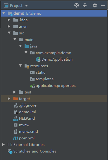 整体的项目结构很类似AndroidStudio的项目目录,DemoApplication即是整个Web应用的入口,application.properties中可以配置应用的相关属性设置