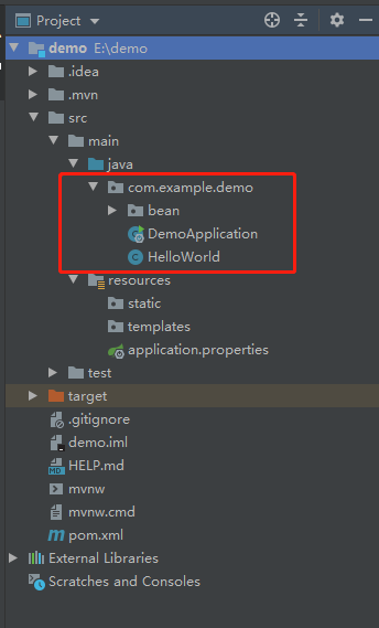 在 com.example.demo 包下新建一 个HelloWorld 类(存放接口方法)以及一个bean目录(存放接收的数据)