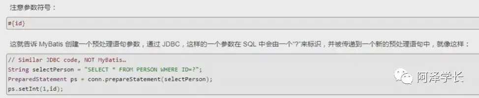 说当我们使用 #{id} 类型参数符号的时候,其实就是告诉 Mybatis 创建一个预处理语句参数,通过 JDBC,这样的一个参数在 SQL 中会由一个 "?" 来标识,并传递到一个新的预处理语句中。