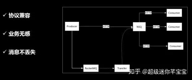 左边是 Producer ,业务通过 Http 连接 NSQ ,对于生产者,实现一个 http 网关,来接收业务生产消息转发到 RocketMQ 。对于消费者,实现一个 transfer 的工具,将消息透传到 NSQ ,这样对消费端是无感的,生产端完成迁移了,消费者可以逐步的往 RocketMQ 上迁移了,所以整个迁移过程还是比较顺利的。