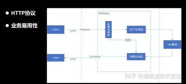 生产处理器,提供 HTTP 协议消息生产支持;消费处理器,消费端的网关,不断从 RocketMQ 拉取消息,通过 http 发送到消费端client;流量调度器,根据 topic 的 SLA 做路由、流量调度。
