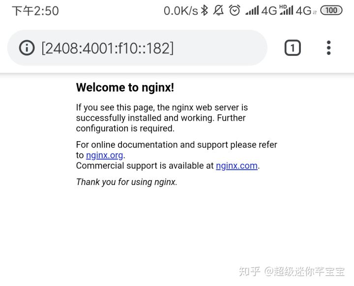 /tmp kubectl get svc nginx NAME TYPE CLUSTER-IP EXTERNAL-IP PORT(S) AGE nginx LoadBalancer 172.17.2.134 2408:4001:f10::182 80:30612/TCP 18s - 在IPv6的环境中测试访问外部的地址,就可以访问到我们暴露的服务,例如我们上面创建的这个LoadBalancer,访问 "http://[2408:4001:f10::182]"地址,就能返回后端的nginx的服务: