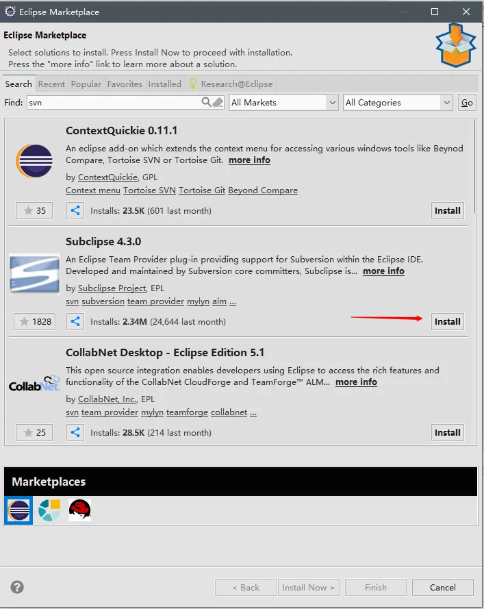 help -->EclipseMarketPlace -->搜索svn-->安装(如图)-->重启生效