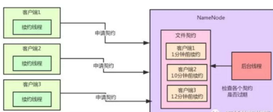 而NameNode内部有一个专门的后台线程,负责监控各个契约的续约时间。