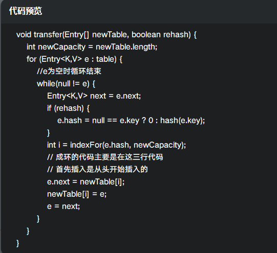 // java 7 是在 while 循环里面,单个计算好数组索引位置后,单个的插入数组中,在多线程情况下,会有成环问题